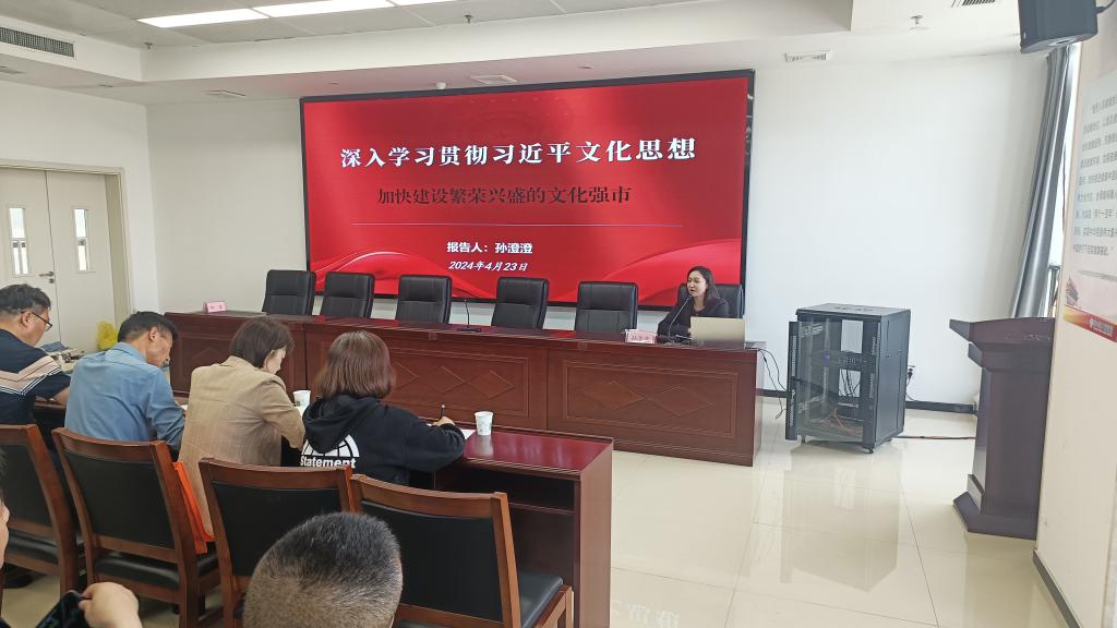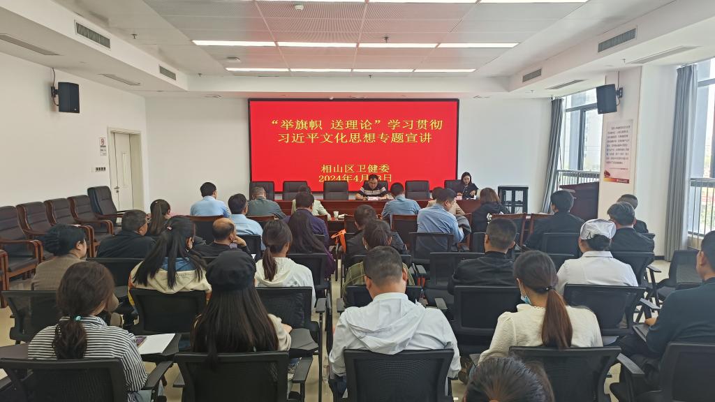4月23日下午,淮北市相山区卫生健康系统“举旗帜·送理论”学习贯彻习近平文化思想宣讲报告会在相山区人民医院召开。beat365官方网站孙澄澄作为淮北市委宣讲团成员,受邀作题为《深入学习贯彻习近平文化思想·加快建设繁荣兴盛的文化强市》的宣讲报告。相山区卫生健康委班子成员全体参会,相山区卫生健康委党委书记柳泰主持会议。