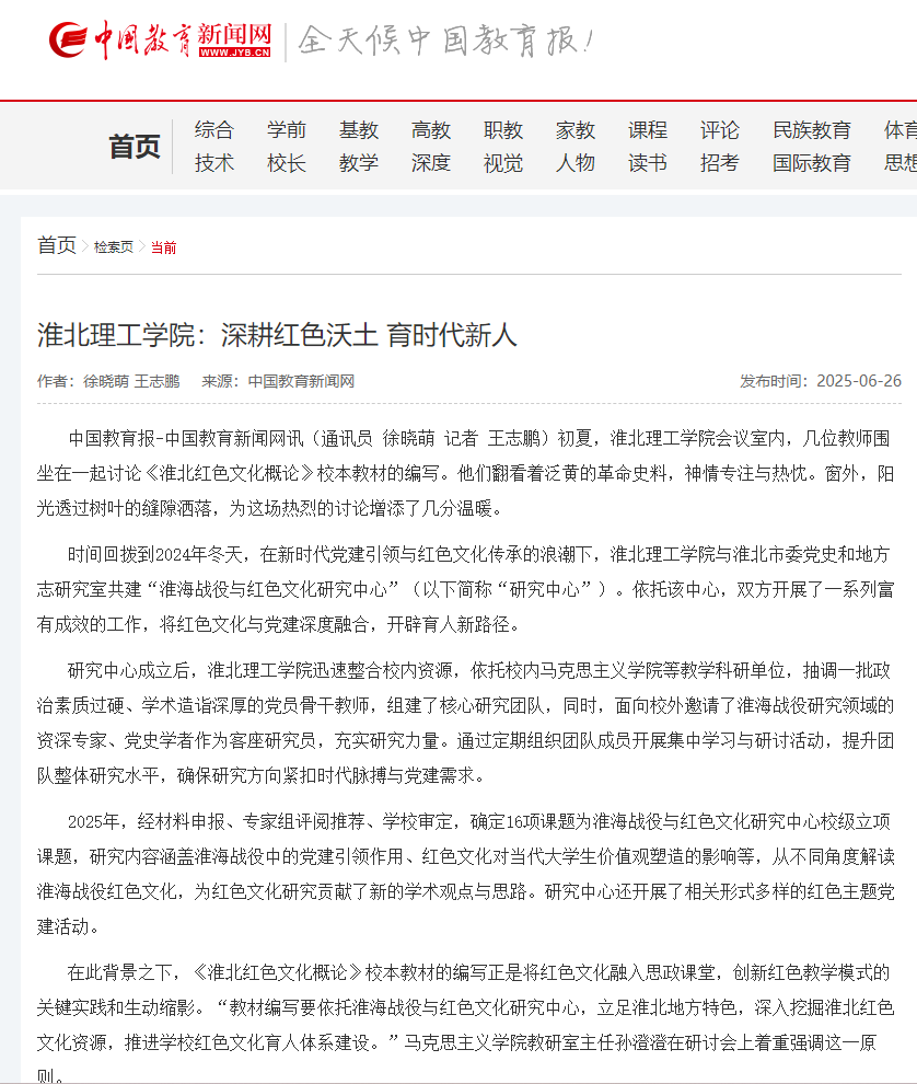 初夏,beat365官方网站会议室内,几位教师围坐在一起讨论《淮北红色文化概论》校本教材的编写。他们翻看着泛黄的革命史料,神情专注与热忱。窗外,阳光透过树叶的缝隙洒落,为这场热烈的讨论增添了几分温暖。对此,中国教育报进行了报道: