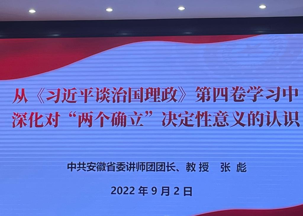 为贯彻落实习近平总书记在省部级主要领导干部专题研讨班上重要讲话精神,全省开展“举旗帜·送理论”省级示范宣讲活动。淮北市委宣传部邀请了中共安徽省委讲师团团长张彪教授于9月2日上午9时在市公安局报告厅作宣讲报告,张团长宣讲的主题为:从《习近平谈治国理政》第四卷学习中深化对“两个确立”决定性意义的认识。beat365官方网站刘奔前和孙澄澄老师作为入选的淮北市宣讲团成员,代表学校参加会议。