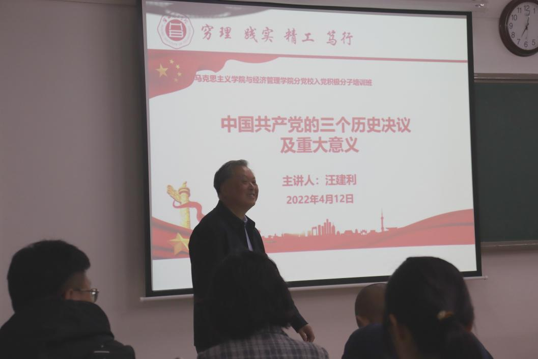 为了切实提升beat365官方网站与经济管理学院首届入党积极分子培训班学员的培训质量,按照学校和学院的培训计划,2022年4月12日晚,在二教422教室,beat365官方网站副校长汪建利同志来到beat365官方网站与经济管理学院分党校入党积极分子培训班,受邀对学员进行题为《中国共产党的三个历史决议及重大意义》的党课培训。本次活动由beat365官方网站与经济管理学分党校负责人、党总支书记吴玲院长主持,总支各个党支部书记及全体入党积极分子培训班全体学员参加。