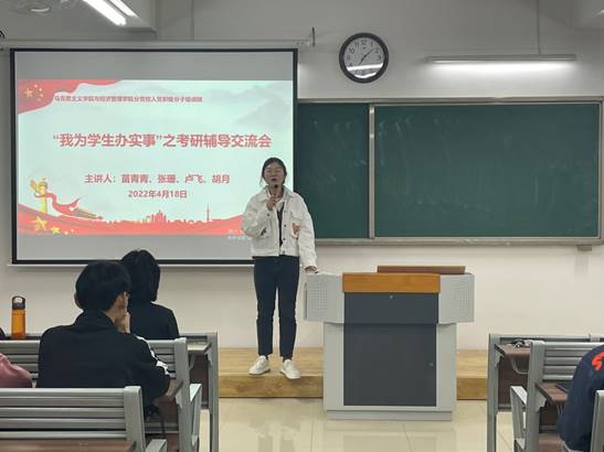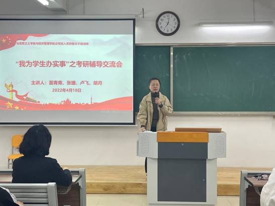 活动开始前,党总支书记吴玲院长向全体参与人员阐明此次考研辅导交流会的起因和重要意义,并点赞选定考研目标的各位同学,同时告诫同学们目标是要通过奋斗和努力才能获得。她还承诺学院将根据同学们的需要开展系列的考研辅导活动,让考研之风助力学院的学风和班风。